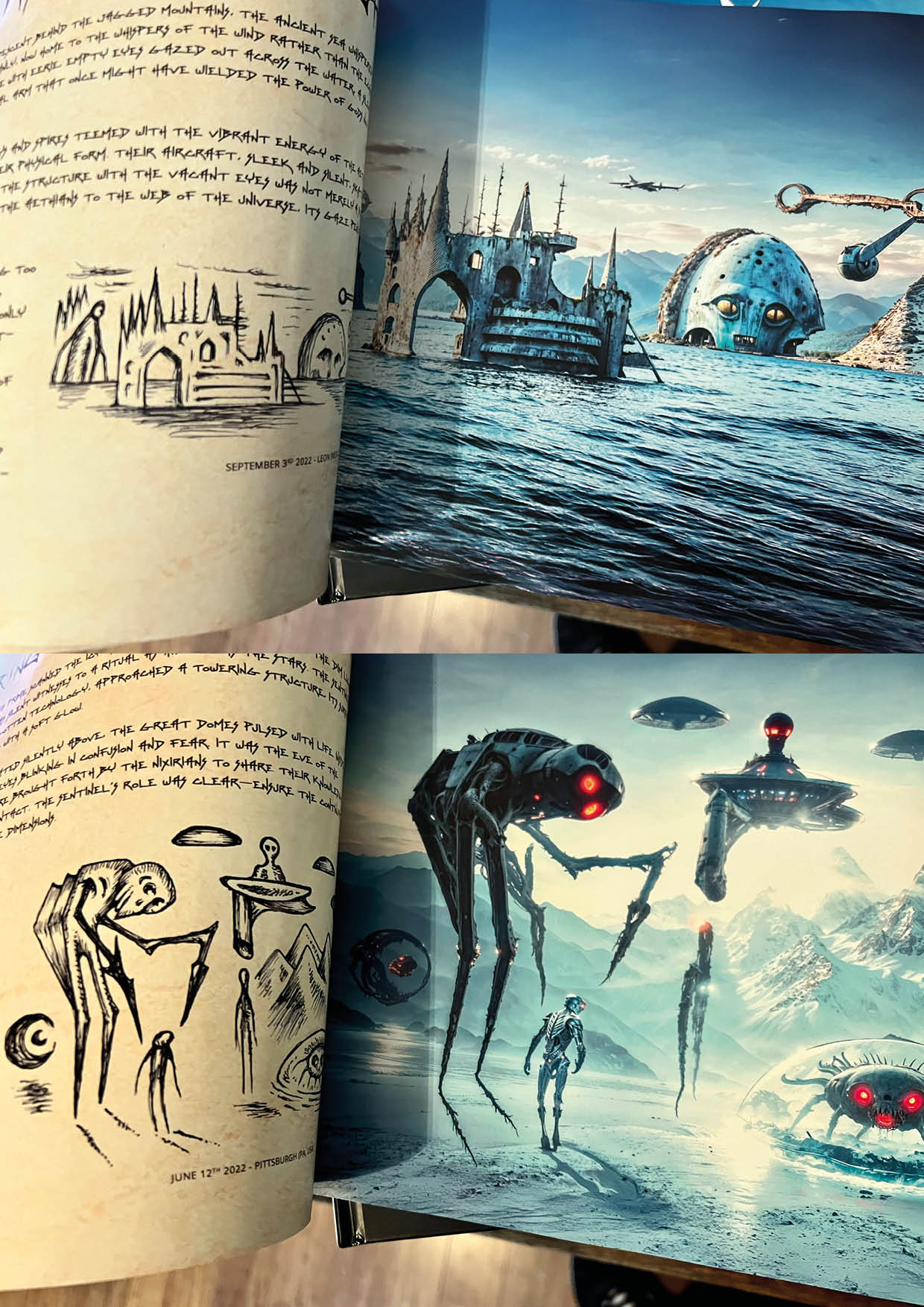 These fantastical worlds, and countless others, began as intricate sketches drawn by Michel "Away" Langevin. What started as simple lines on paper have now been brought to life through a daring experiment with digital tools, transforming his visionary art into immersive realities. Each image was reimagined in ways never before conceived, combining the timelessness of hand-drawn sketches with the limitless possibilities of modern technology.