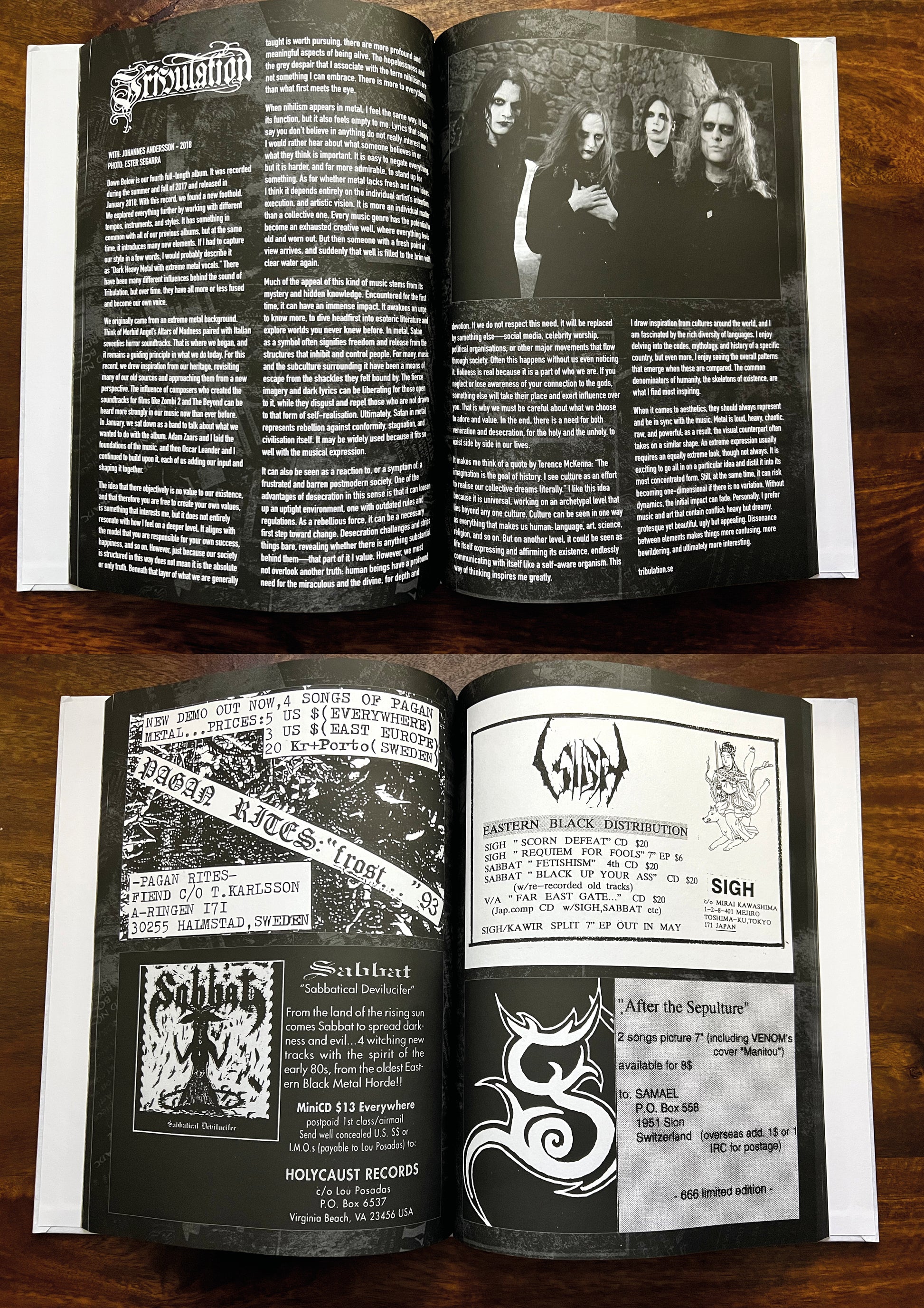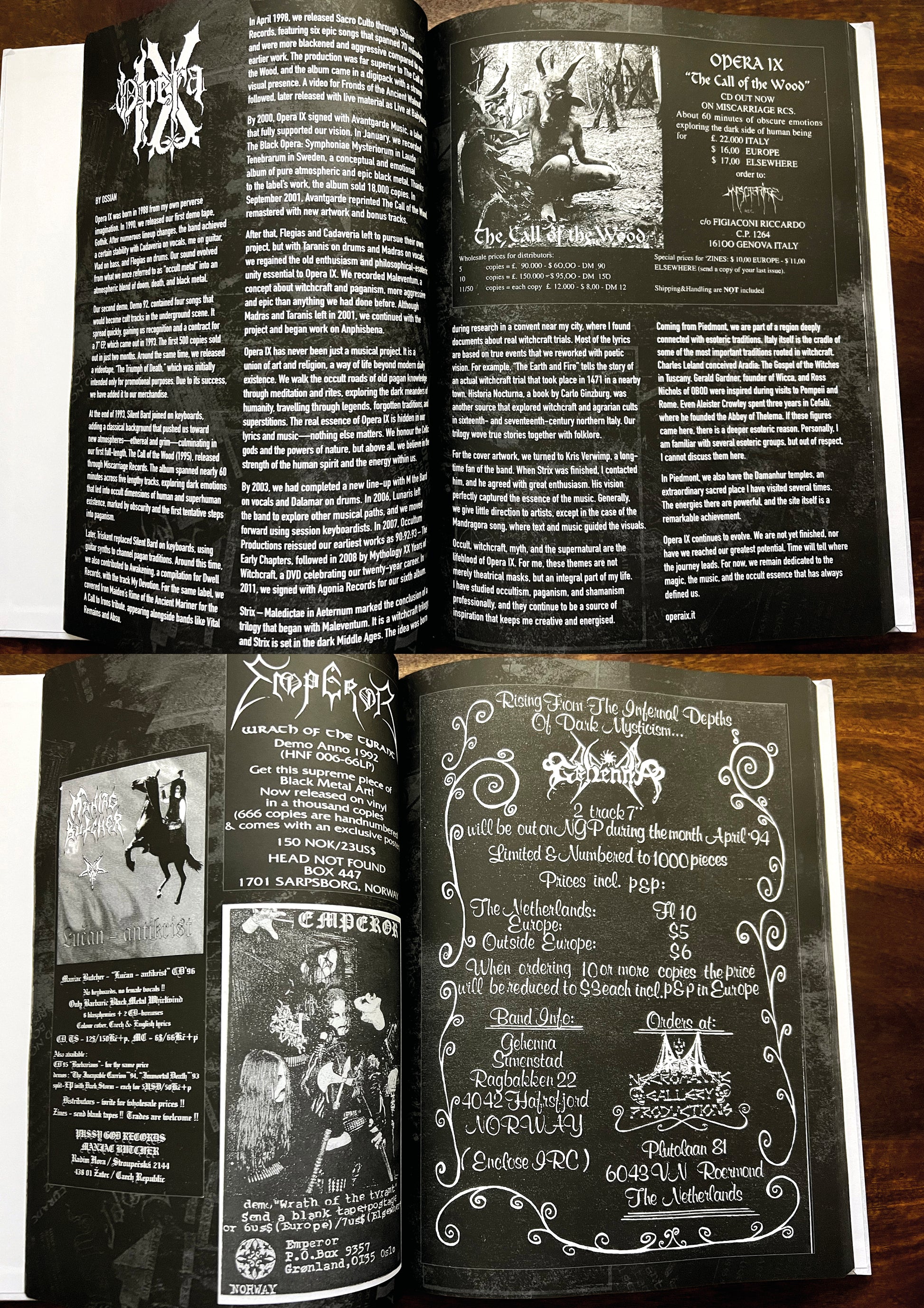 Every page immerses the reader in the dark, anarchic aesthetic of the scene—high-contrast black-and-white imagery, hand-drawn logos, cryptic symbols, and chaotic, collage-style layouts that mirror the intensity of the music. From legendary Norwegian acts to influential underground bands across Scandinavia, these artefacts reveal a culture built on DIY ethics, rebellion, and complete independence from mainstream recognition.