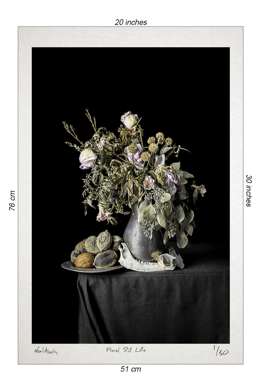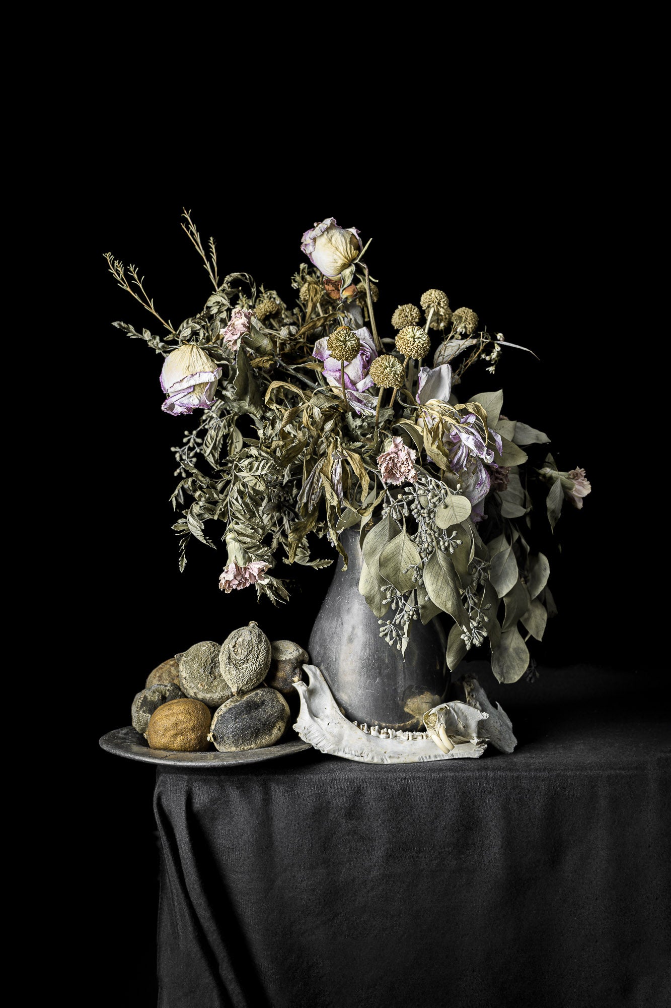 Blending a confrontational modern “dark art” aesthetic with the timeless themes and iconography of 17th-century still life paintings, this bold composition offers a detailed and symbolically dense meditation on death, transience, and the unlikely beauty of decay.