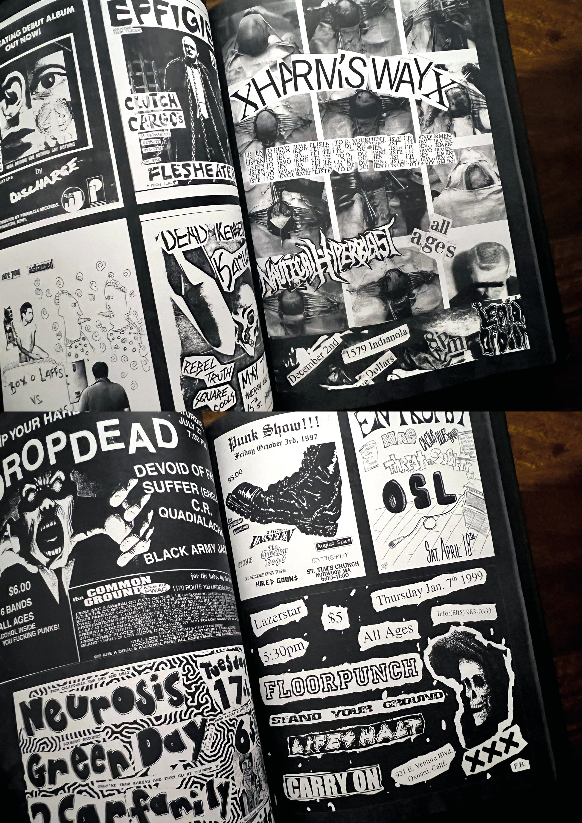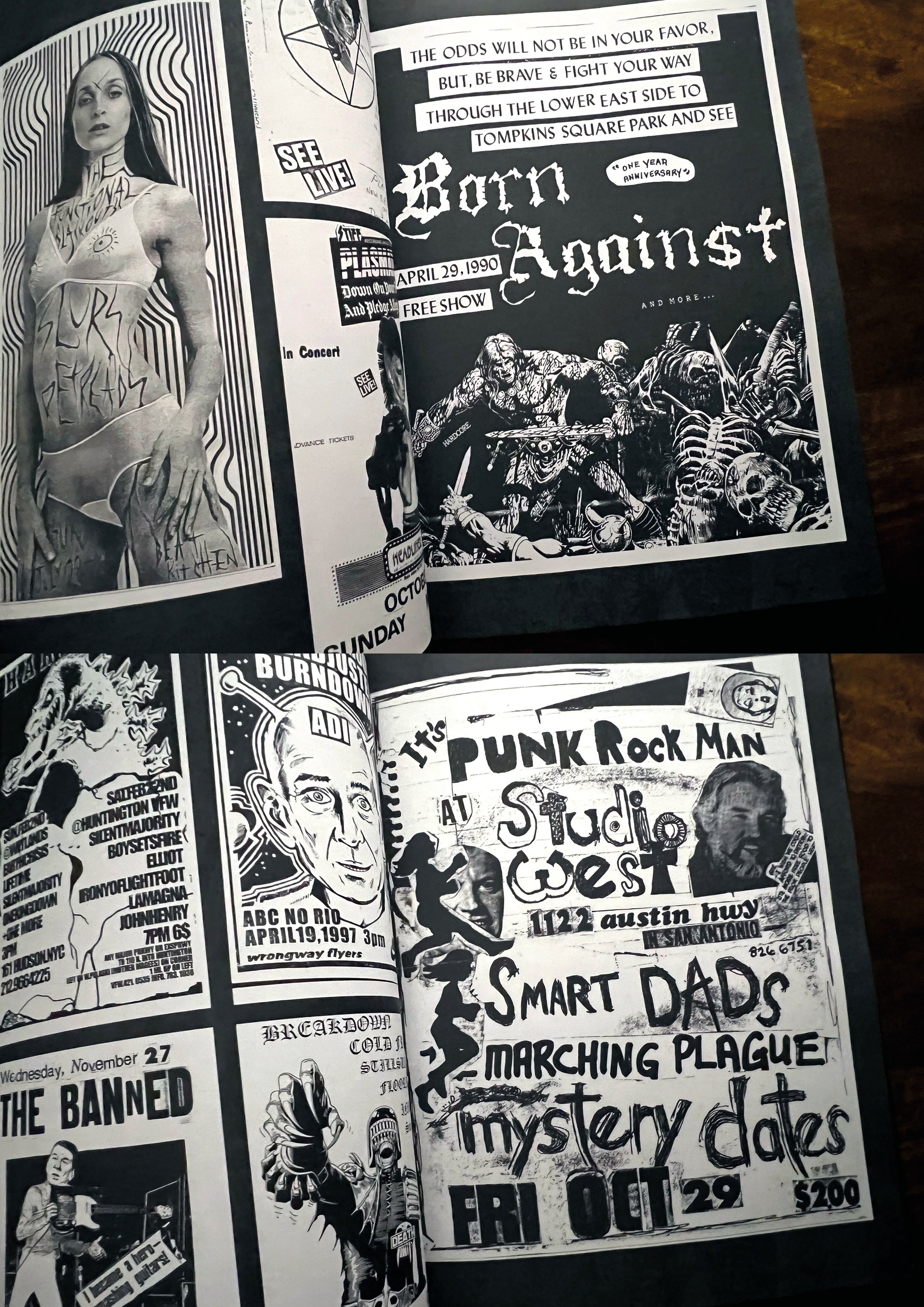 Every flyer captures the chaos and energy of the era, from hand-drawn graphics and cut-and-paste layouts to xeroxed photocopies that defined the aesthetic of underground shows. From legendary hardcore acts to obscure local bands, these pages preserve the spirit of a movement that thrived on rebellion and the do-it-yourself ethos.